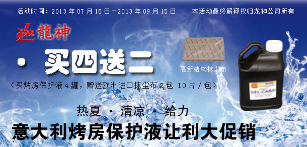 "熱夏 清涼 給力" 意大利烤房保護(hù)液讓利大促銷! 2013-07-16 25081 "熱夏 清涼 給力" 意大利烤房保護(hù)液讓利大促銷!活動(dòng)時(shí)間:2013年07月15日至2013年09月15日。 時(shí)長(zhǎng):共計(jì)2個(gè)月