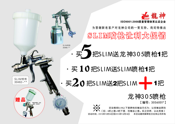 2013年10月至12月SLIM噴槍促銷方案 2013-10-12 11354 SLIM噴槍讓利大促銷,起始時(shí)間:2013年10月14日至2013年12月14日,時(shí)長(zhǎng):二個(gè)月。